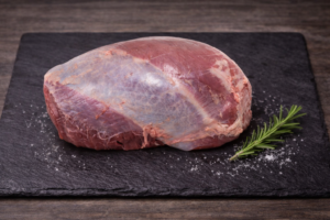 Carne roja intensa, fibras finas, sin grasa interna visible.