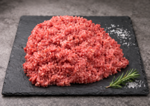 Crudo: mezcla roja con puntos de grasa, textura granulada húmeda.